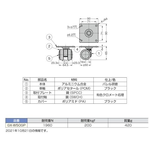 低重心、重量用のプレートタイプです。双輪なので旋回性に優れています。本体は軽くて強いアルミ合金製です。安定感のある双輪で滑らかな回転機能と優れた耐久性を備えたキャスターです。 |