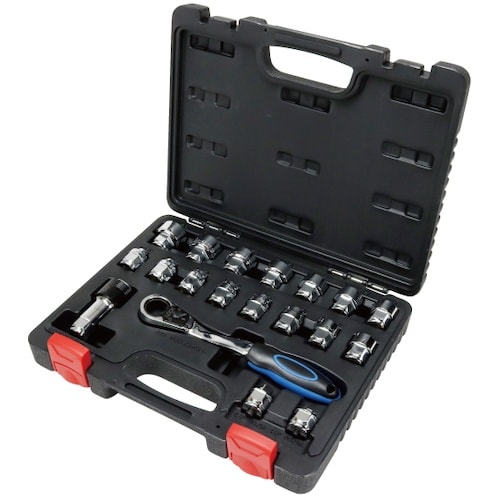 セーフティロックとクイックリリースで、ソケットの着脱が簡単で確実です。収納・持ち運びに便利な専用ケース付きです。「しめる」「ゆるめる」をレバーで簡単に切り替えられるラチェットレンチです。 |