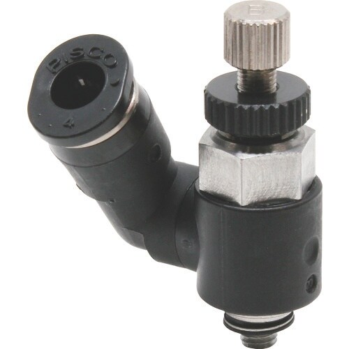 駆動機器の速度制御弁です。取付け後、金属本体と樹脂本体が回転しますので、チューブの取り出し角度が変えられます。 |