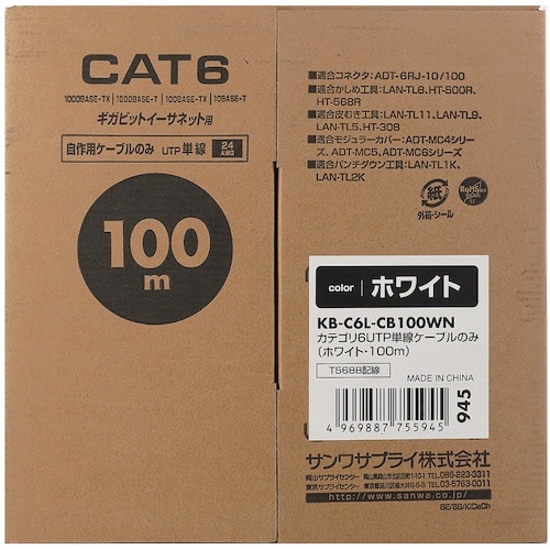 自作用UTPカテゴリ6単線ケーブルです。(コネクタは付属していません)長さがわかるレングスマークが1mピッチで付いています。ギガビットイーサネットに対応したカテゴリ6適合のLANケーブルです。 |