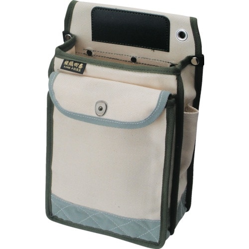 丈夫な国産厚綿布を使用しています。パラフィン防水加工を施しています。ベルト通部分にヨレ止め付きです。前面フタ付きポケットです。作業工具、電動工具等の収納に。 |