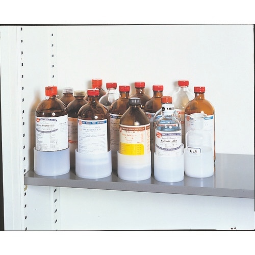底面の強力な磁石が試薬ビンの転倒を防止します。酸類、引火性溶剤などの試薬ビン用に、4種類のサイズを用意しています。スチール製薬品戸棚の試薬びんの転倒防止用。