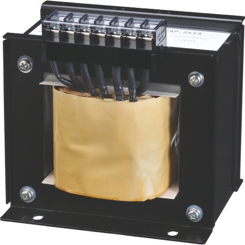 単相、複巻タイプです。50/60Hz両用になります。耐電圧は1.5KVです。F種絶縁となります。JIS C−5310/6436適用です。P−S間シールド付です。200Vを100Vに落とします。 |