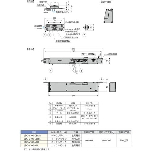 | 注意事項 | ※適応ドア質量/15ー40kgのLDD−V型もございます。ドア幅が900mmを超える場合はお問い合わせください。 |