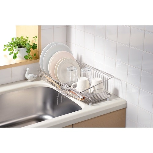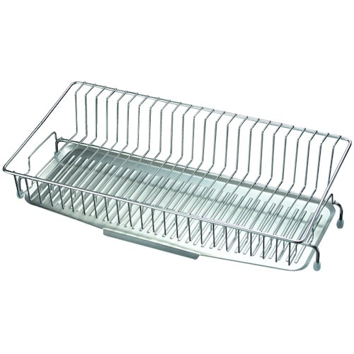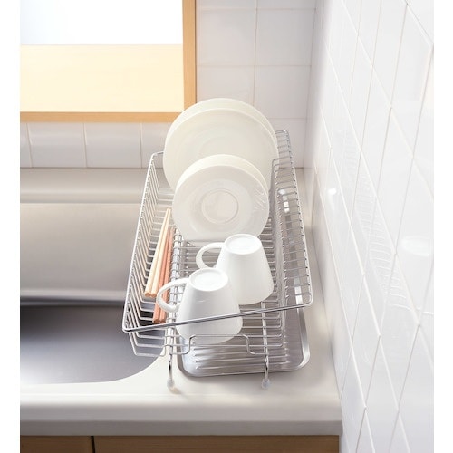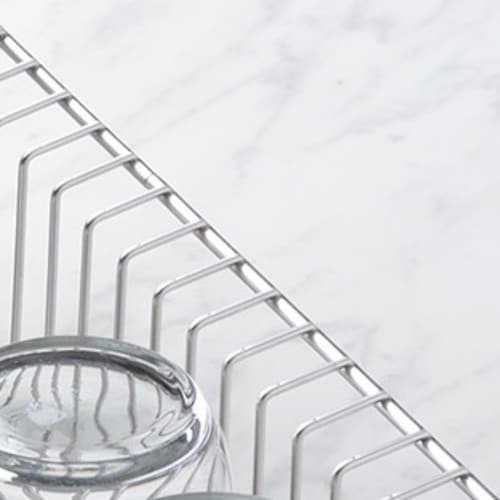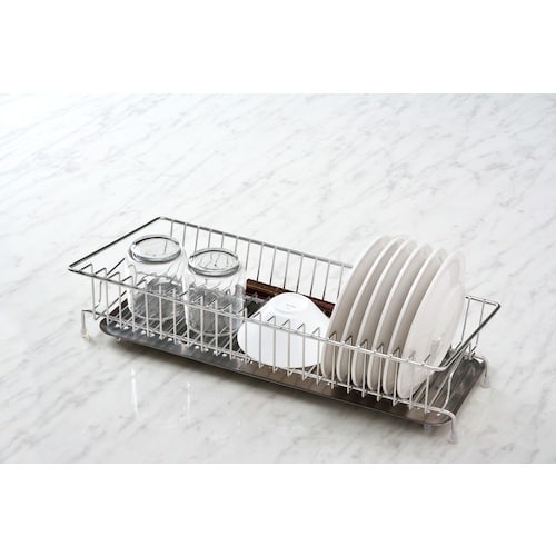 シンク横のせまいスペースに置きやすいスリムタイプの水切りカゴです。水受けの波型のトレーに傾斜がついており、洗い物の水はシンクに流れます。 |