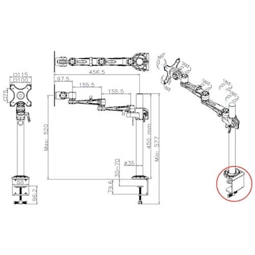 軸の移動で、多彩なモニター角度に変更可能です。4つの軸を動かすことで、奥行きのない机でも広々利用できます。支柱の取り付けは手でハンドルを回すだけで可能です。モニター固定。 |