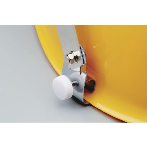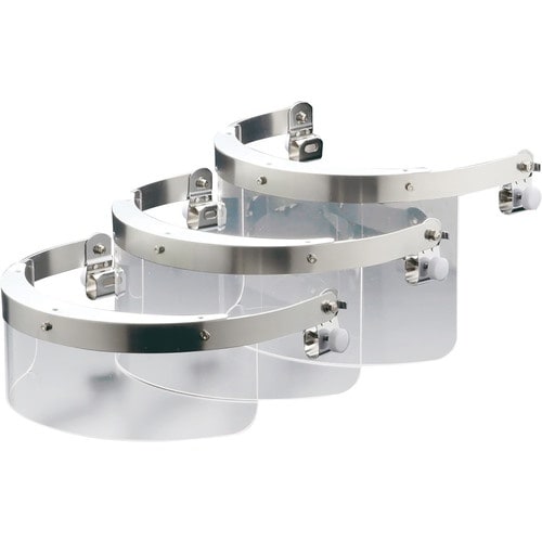 平面シールドの長さを短くしたもので目の周囲を中心に保護します。MP型ヘルメット対応の取付金具です。(その他のタイプもあります。液体飛沫からの防御に。 |