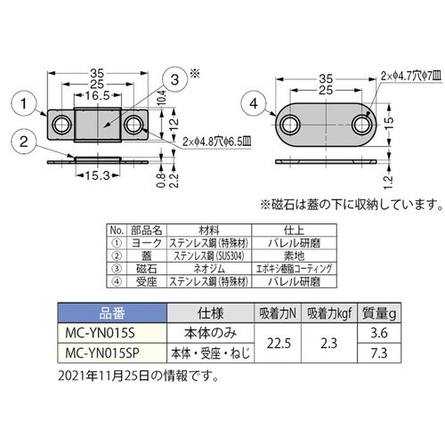 | 注意事項 | ※水まわりや高温多湿環境下でご使用の場合、マグネットに付着した鉄粉から錆が発生する場合があります。80 ℃以下の場所で使用してください。受座は両側のヨークが2ヶ所とも当たり、直接蓋に当たらないように取り付けてください。直接当たると磁石が割れて使用できなくなる恐れがあります。本製品の取付面側には、必ずねじ及びリベットの逃げ加工を行ってください。 |