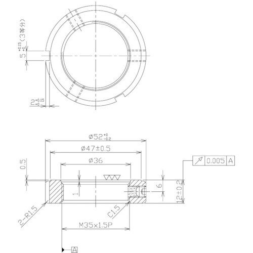 精密ロックナットは、ベアリング固定用ナットですが、精度を要する回転体にその効果を充分に発揮できます。軸方向に対しセットスクリューが直角になっており、且つ3分割(120度等配)の設計となっております。