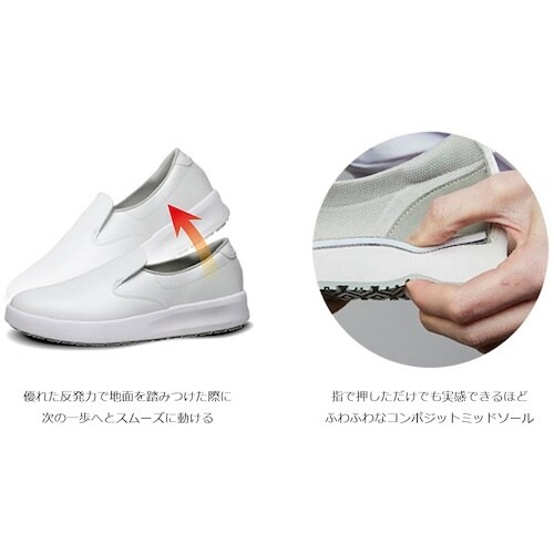コンポジットミッドソールがふわふわな履き心地を実現しました。跳ねるようなクッション性でスムーズな足運びと疲労軽減を実現しました。立ち作業に最適です。 |