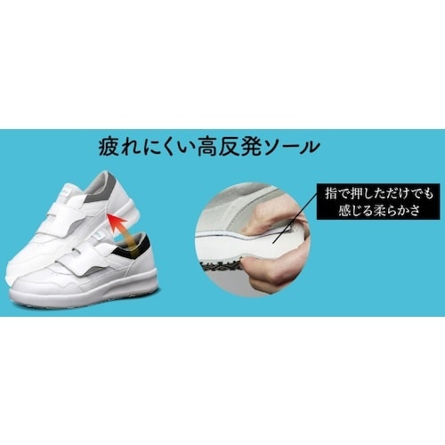 新開発の高反発EVAミッドソールにより、ソフトでふわふわな履き心地です。跳ねるようなクッション性でスムーズな足運びと疲労軽減を実現し、立ち仕事に最適です。