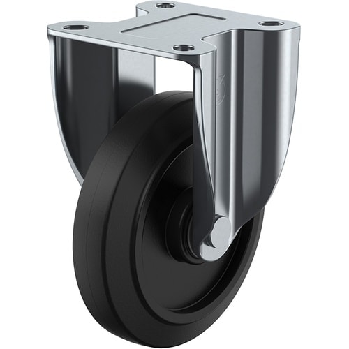 取付ピッチが自在、自在ストッパー付、固定式共に同一です。軽量で走行性に優れたナイロンホイルゴム車輪を使用しています。台車、ワゴンなどに。 |