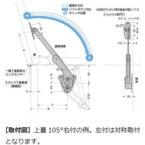 ラプコン機構を搭載した上蓋用のソフトダウンステーです。扉が最大に開いた状態を保持するキャッチを組み込んでいます。取付位置により、全開時の角度が70°、106°になります。各種産業機器。 |