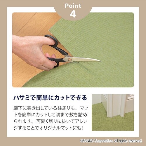 撥水加工を施しています。簡単に取り付け、取り外しができます。マットの裏面が床にピタッと吸着するのでズレません。ハサミで手軽にカットできます。 |