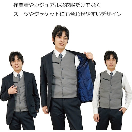 日本製の生地を採用し、味わいのあるウォッシャブル加工を施したスーツ姿にもフィットする発熱ベストです。発熱配線には東レの高性能炭素繊維トレカ糸を採用し、素早く安定した発熱を実現。 |