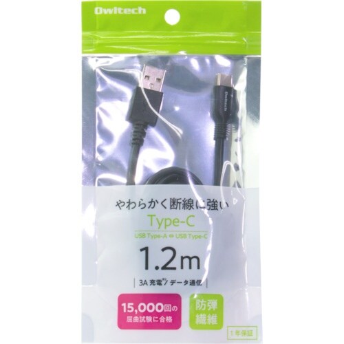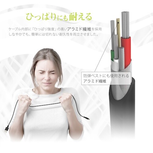 取り回しの良い柔らかい素材でありながら、非常に断線に強いケーブルです。3Aの高出力充電に対応しています。安心の1年保証が付いています。 |