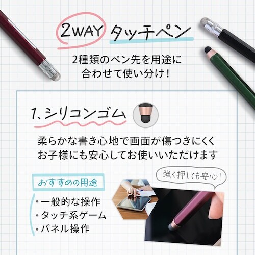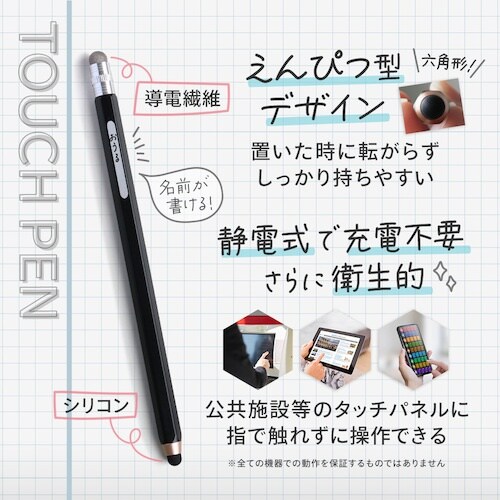 えんぴつの形をした静電式のタッチペンです。鉛筆と同じ六角形で転がりにくく持ちやすい形状になっています。名前を記入するスペースがあるためお子様のご使用にもおすすめです。 |