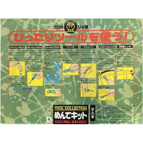 | 注意事項 | ※<ソケットレンチ・6角レンチ・ドライバー・コンビレンチ類>ボルト・ナット・ネジのサイズにあったものを必ずお使いください。ハンマー代わりに叩かないでください。<ペンチ・ウォーターポンププライヤー類>非絶縁工具です。 |