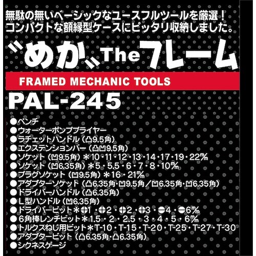 | 注意事項 | ※<ソケットレンチセット・6角棒レンチ・トルクスネジ用レンチ・ドライバー類>ボルト・ナットのネジに合ったものを必ずご使用ください。ラチェットハンドルをハンマー代わりにして叩かないでください。<ペンチ・ウォーターポンププライヤー類>非絶縁工具です。 |