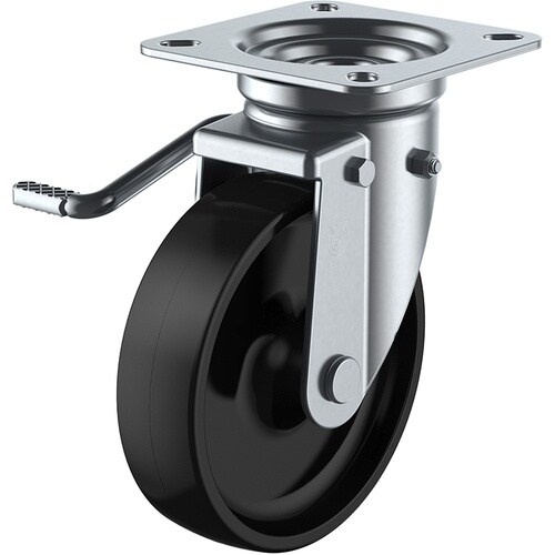 標準的な大型キャスターで、重量物の運搬に数多く使用されています。耐摩耗性、耐熱性に優れたフェノール車輪を使用しています。重量物の運搬に。 |