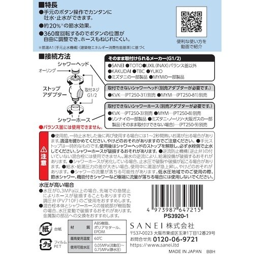 | 注意事項 | ※使用前、一時止水をした後に再び使用する場合には1ー2秒間熱いお湯が出る場合があります。適温を確かめてください。やけどのおそれがありますのでご注意ください。手元ストップは一時的なものです。使用後はシャワーヘッドのストップを解除し、必ず水栓側で止水してください。 |