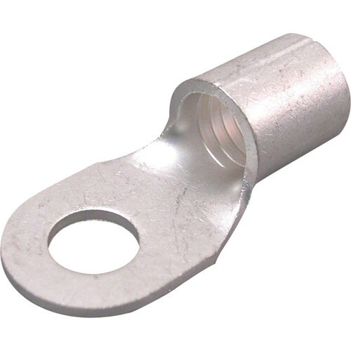 接触面(舌部)が丸く、ねじ固定用の取り付け穴がある裸圧着端子です。軟鋼のより線電線の接続に。