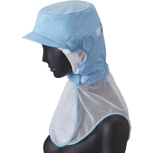 ツバは耐洗濯性の高い織芯、頬、首はニット素材で落髪・ズレを防止します。立体ケープで動きやすさも考慮しています。前部の留めはマジックテープで調整可能です。