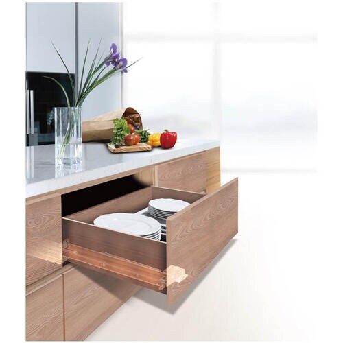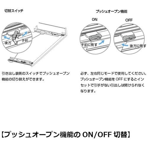 スライドレールが外側から見えないため、キャビネットなどのデザイン性を損ないません。プッシュオープンで開き、閉じる際はソフトクローズします。閉じ際の跳ね返りがなく、スムーズに閉まります。 |