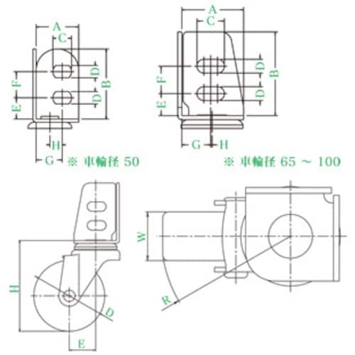 許容荷重(daN):90 | 許容荷重(kgf):91.8 | 車輪径D(mm):100 | 車輪幅(mm):32 | 取付高H(mm):132 | …