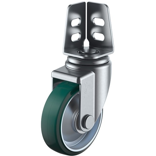 アングルへネジやボルトで簡単に取り付けることが出来ます。耐油性、耐摩耗性に優れたウレタン車輪を使用しています。アングル式の棚や軽荷重機器運搬に。 |