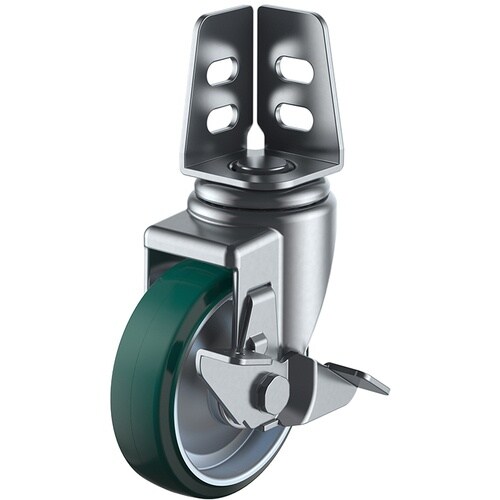 アングルへネジやボルトで簡単に取り付けることが出来ます。耐油性、耐摩耗性に優れたウレタン車輪を使用しています。アングル式の棚や軽荷重機器運搬に。 |