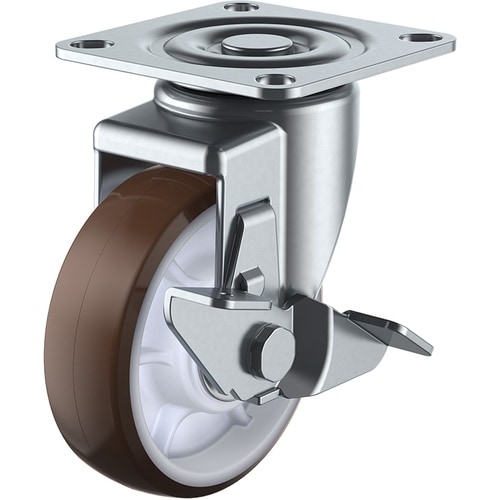 標準的な中型キャスターで、重量物の運搬に数多く使用されています。耐油性、耐摩耗性に優れたウレタン車輪を使用しています。台車、ワゴンなどに。 |