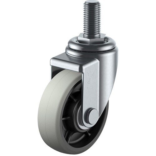 標準的な中型キャスターで重量物の運搬に数多く使用されています。ねじ込みタイプでワゴンやラックなどに適します。軽量で耐油性、耐摩耗性に優れたナイロンホイルウレタン車輪を使用しています。 |