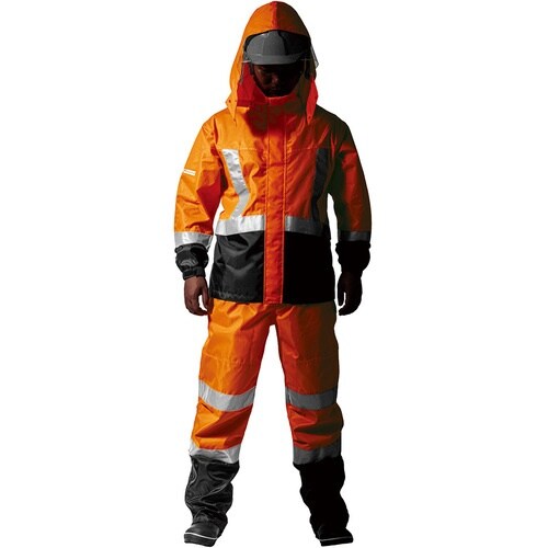 暗闇でも安全な360度高視認なレインウェアです。雨の日の作業に。