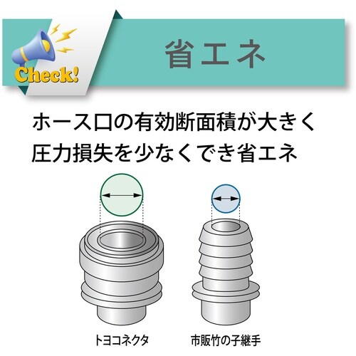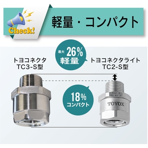 漏れ抜け等の生産トラブルを防止するホース継手です。TC3−Sに比べて軽量でコンパクトなので、狭所でも簡単に取り付けが可能です。 |