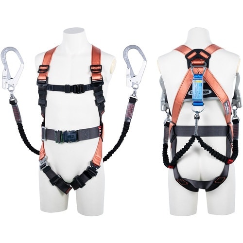 作業ベルトが標準装備となっており、現場での作業が多い方に最適です。墜落制止時の衝撃を骨盤全体で受け止め、身体保持の安定性に優れているV型腿ベルトです。 |