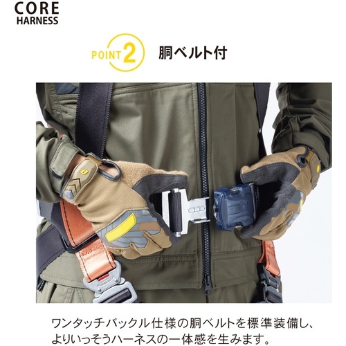 作業ベルトが標準装備となっており、現場での作業が多い方に最適です。墜落制止時の衝撃を骨盤全体で受け止め、身体保持の安定性に優れているV型腿ベルトです。