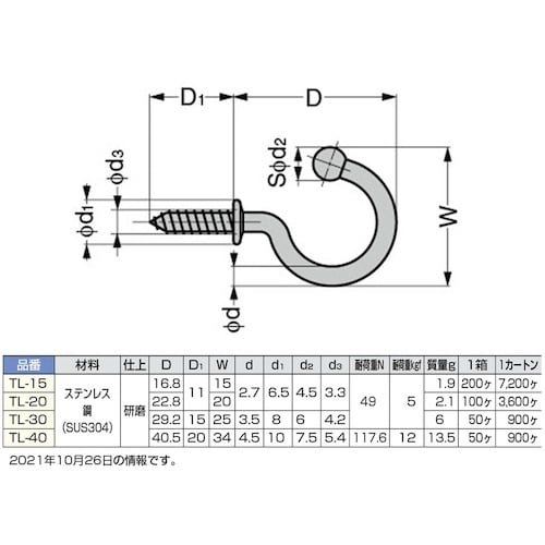 吊下荷重(kgf):12 | D(mm):40.5 | H(mm):34 | 材質・仕上げ:ステンレス鋼 | 単位:1個