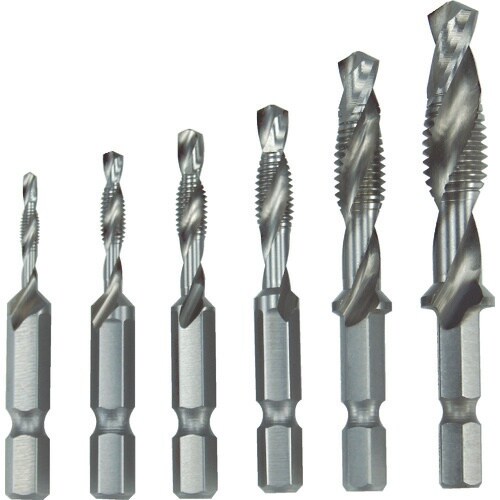 タップとドリルがこれ1本でOK(サイズ:M5)です。ドリル穴あけ、雌ネジ切り、簡易バリ取りが一連の作業で可能です。 |