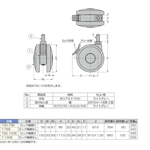 1つのレバー操作で、車輪ロックと旋回ロックを同時に行います。車輪の外周面はポリウレタン製で、微振動や音を吸収し、ソフトで静かに回転します。 |