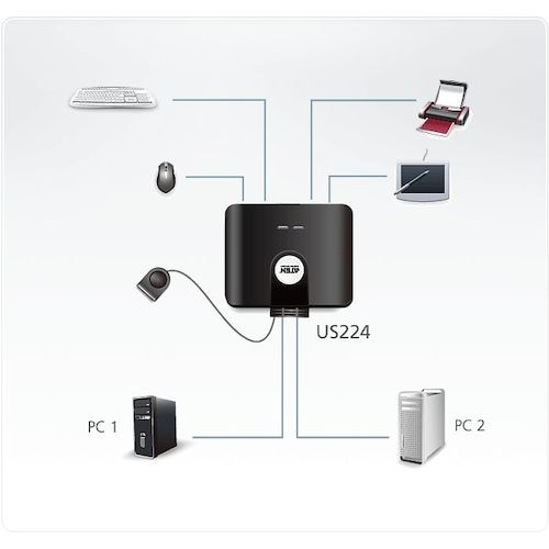 USBポートを4ポート搭載です。2台のコンピューターで4台のUSBデバイスを共有 − USBキーボードやマウス、周辺機器を共有可能です。 |