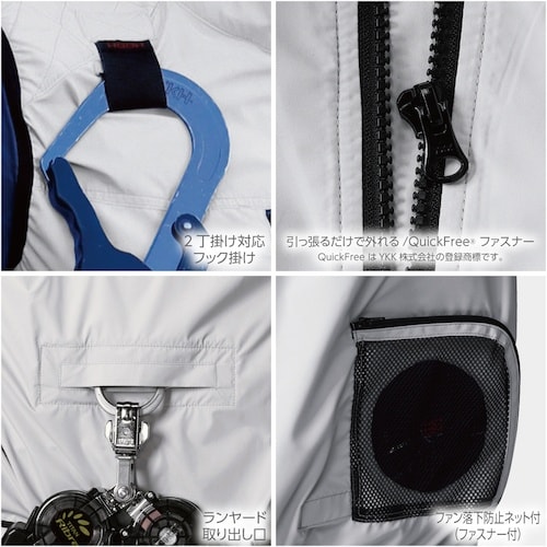 夏の作業に欠かせない空調機能を取り入れた空調ファンを取り付けれる快適ウェア。安全性にこだわったフルハーネス対応。2丁掛けフック対応のフルハーネス対応。引っ張るだけで外れるQuickFreeファスナー。 |