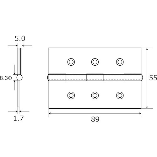 全長(mm):89 | 幅(mm):55 | 厚さ(mm):1.7 | ねじ穴数:6 | D2(mm):8.3 | 推奨扉厚(mm):30〜33 | …