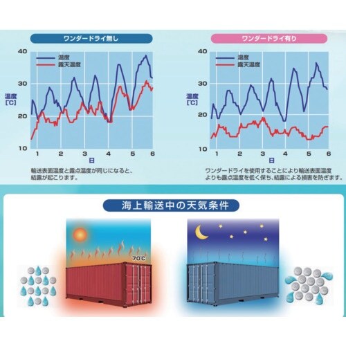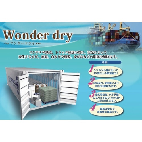海上コンテナ内専用の乾燥剤として開発した高機能乾燥剤となります。海上コンテナ内における結露、製品への錆、カビ、腐食、腐敗、布上などの問題を解決できます。シリカゲル等に比べて10倍以上の吸湿能力。 |