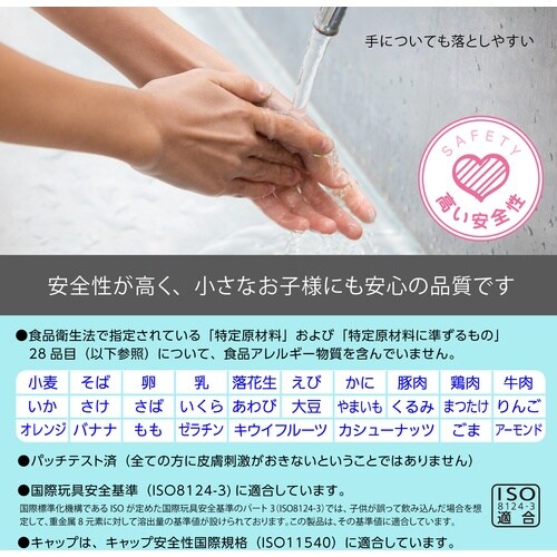 いろいろなものに描けて水で落とせる、安全性の高いえのぐです。紙以外にも、ガラスやペットボトル等の非吸収面に描くことができます。ローラー遊びやスタンピングにも適しています。 |