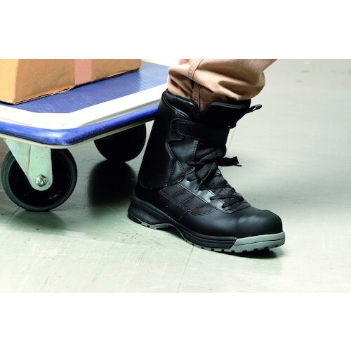 軽くて丈夫な樹脂製プレートが、重い台車などの接触事故からアキレス腱部を守ります。合成ゴム製のトウガードキャップが、破損しやすいつま先部を保護します。かかと部に底減りしにくい合成ゴムを使用しています。 |