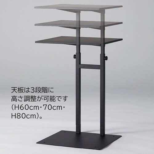 天板は商品をディスプレイする際に、脚部までのスペースは在庫をストックする際に、ピッタリ!天板裏面に補強バーが2本入っています。天板は3段階に高さ調節が可能です。(H60cm・70cm・80cm) |