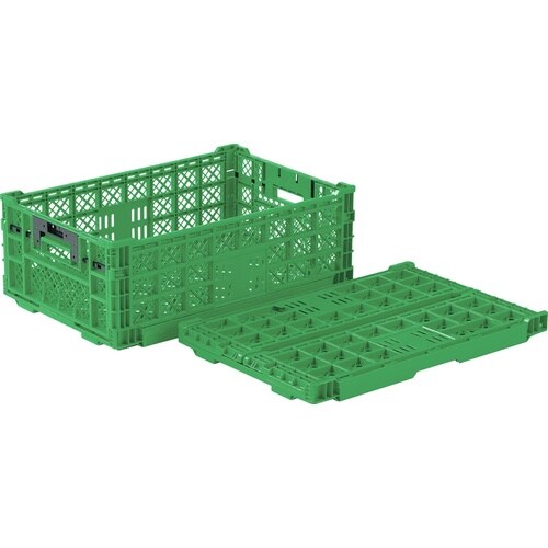 折り畳めるコンテナーです。折りたたむと容積が約1/4になり、物流コストの低減、流通の効率化をサポートします。