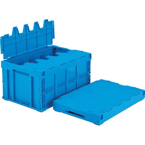 一体型のフタ付きオリコンです。折りたたむと容積が約1/4になり、物流コストの低減、流通の効率化をサポートします。