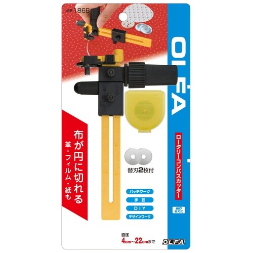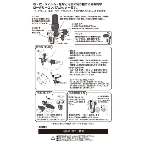 円を描く要領で布・紙・フィルムなどを簡単に、きれいな円形が切り抜ける画期的なカッター。 |